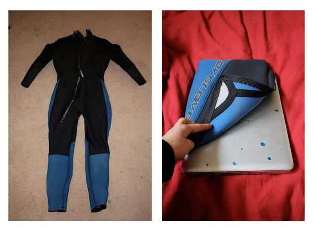 Soy una persona que practica surf que tiende a recoger tablas de surf y trajes extras para que todos mis amigos puedan aprender! Al hacer esto, yo he coleccionado algunos muchos y algunos son wayyyy más allá de una fecha permanente con el contenedor de basura. La caja del ordenador portátil que conseguí como regalo dice su hizo de 'traje neopreno' y tengo la idea de hacer mi propio!
