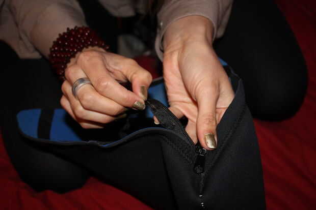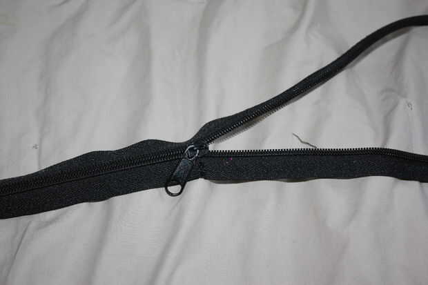 Mantener la costura de la cremallera (utilice una máquina de coser si tienes acceso a uno!) hasta que se han alineado los restantes cantos abiertos con cremallera. Tardará un rato...