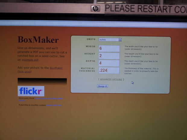 Comenzar, tome la pinza y medir la profundidad de la hoja de acrílico y registrar las mediciones. Entonces, usando la computadora, vaya a http://boxmaker.rahulbotics.com y entrar en sus mediciones de recomendado: (otra vez, para este Instructable vamos a hacer un cuadro que es 6 x 2 x 4 pulgadas, y que usando estas medidas en todos los otros ejemplos). Después de haber introducido en sus mediciones, descargue el archivo y abrirlo en Coreldraw.
