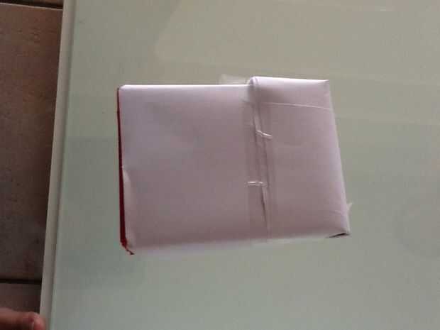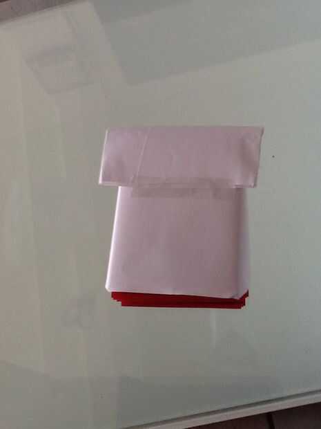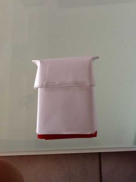 Aplanar el exceso y doble hacia abajo y cinta adhesiva. Si lo haces correcto el debe ser una forma del triángulo en el lado y cinta adhesiva.