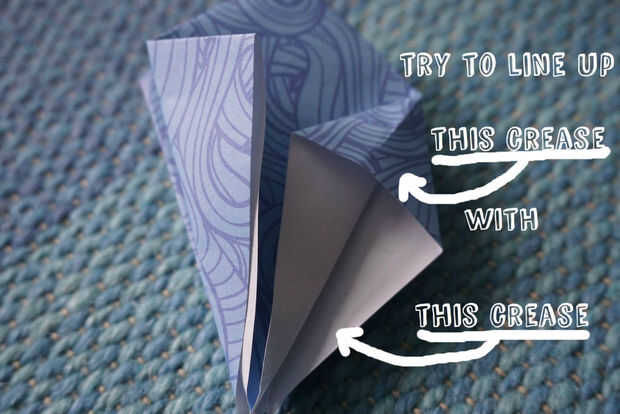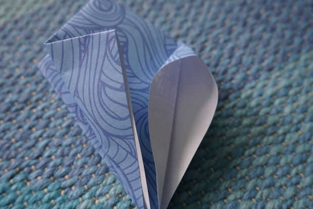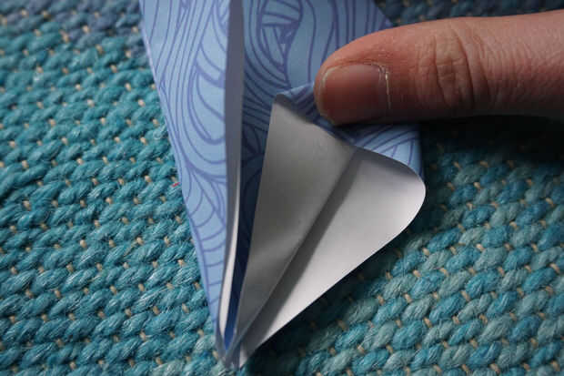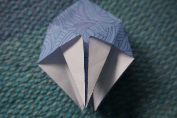 Abrir un poco la parte superior de la tapa de esquina y aplanarlo hacia abajo en forma de triángulo. Hacer lo mismo a la otra esquina y otro lado del papel.