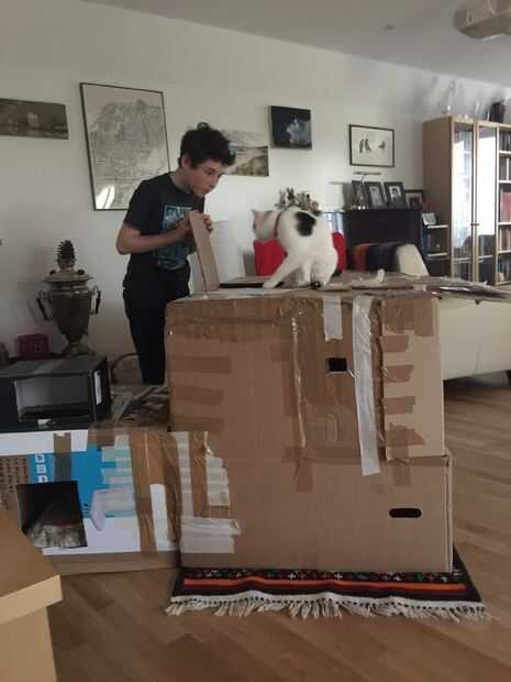 demostró cómo hacer una caja utilizando una caja de almacenaje, pegamento de silicona, cortador y paño grueso (alfombra). Comparé mi viejo sistema de la caja de litera del gatito para arriba con la nueva caja para ayudar a los televidentes a hacer su