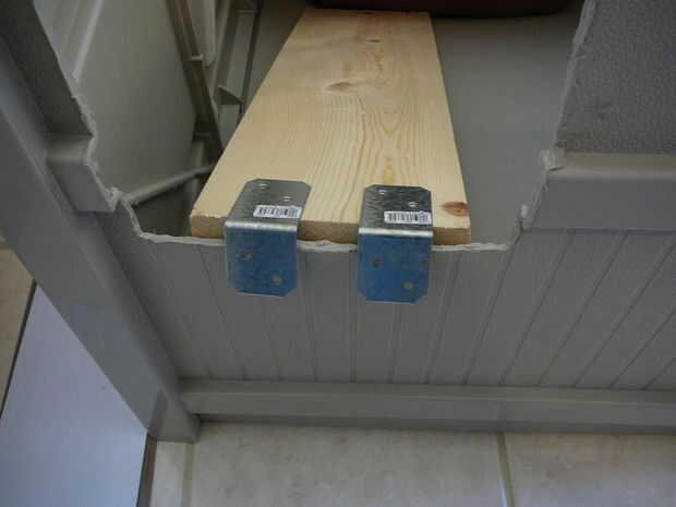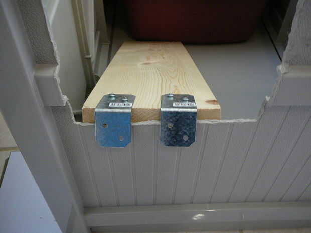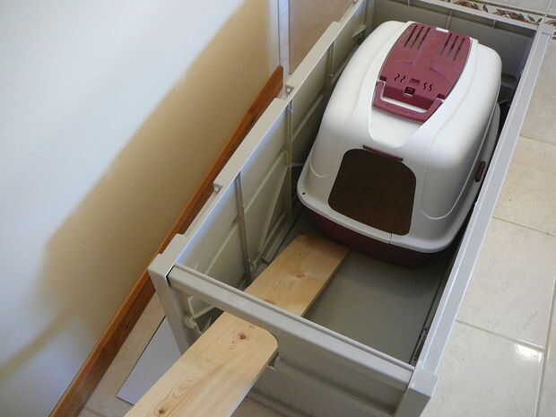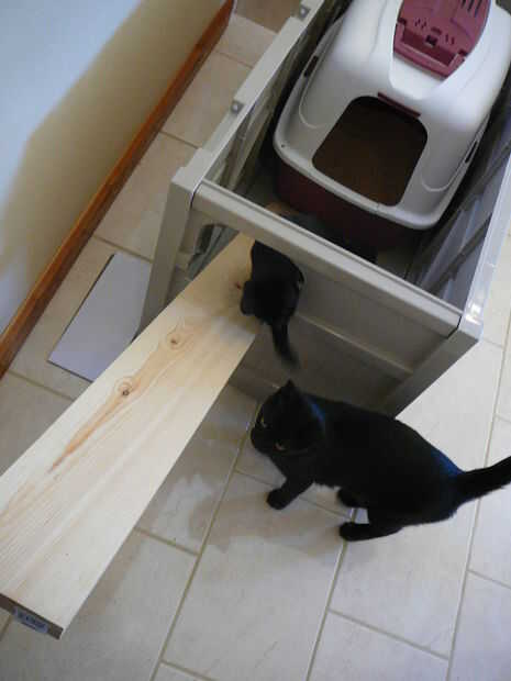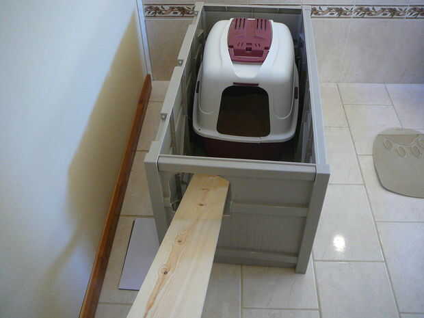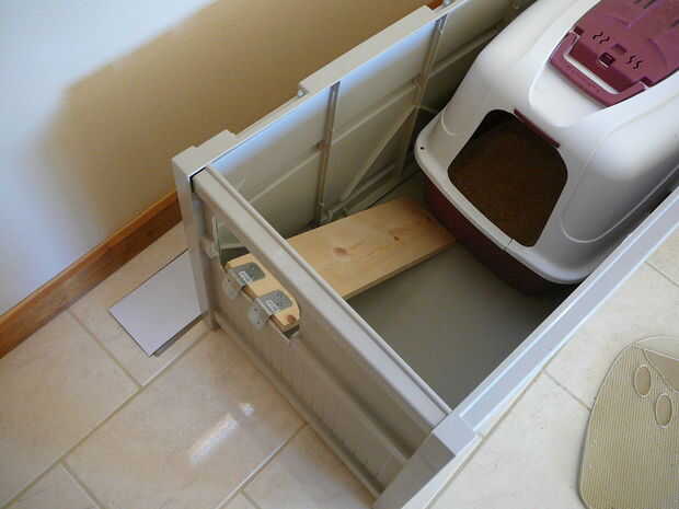 Atornille los soportes en L para la rampa de madera, pero no a la caja. Simplemente se deslizará sobre el borde del plástico, por lo que la rampa es desmontable para la limpieza por debajo. (Rampa desmontable = característica muy importante para la limpieza.)