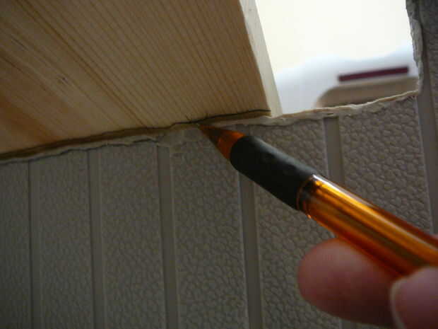 Utilizar una regla o escuadra de carpintero para enderezar la marca del lápiz. Es mejor errar en el lado de una rampa más corta, para que veáis que marcó la línea enderezada hacia el lado de la caja de mi tarjeta.
