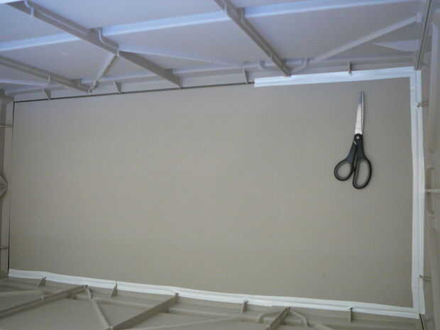 Para obtener la cinta en posición plana, tuve que poner en su lugar, y luego cortar la cinta a cada lado de las crestas en los lados de la caja de plástico. Esta izquierda pequeños lugares que no están selladas, pero sirve el propósito de mantener la mayor parte de la camada suelta fuera de las grietas.