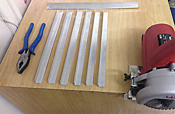 Compré los canales de aluminio en una ferretería cortar 3 x 120 cm de longitud para carting fácil. Usé una sierra eléctrica para cortar en pedazos largos de 30 cm. Puede utilizar una sierra para metales también como el canal L de aluminio es sólo de 1 o 2 mm de espesor.