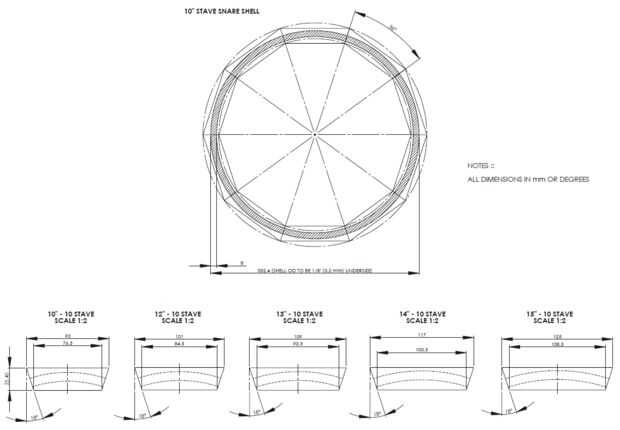 Vamos a hacer un redoblante 14" 6.5" profunda y hecho de 10 Varas (segmentos). El dibujo arriba muestra algunas otras opciones si quieres hacer un caparazón de diferentes diámetros. Familiarizarse usted mismo con sus dimensiones, luego vamos a entrar a picar.