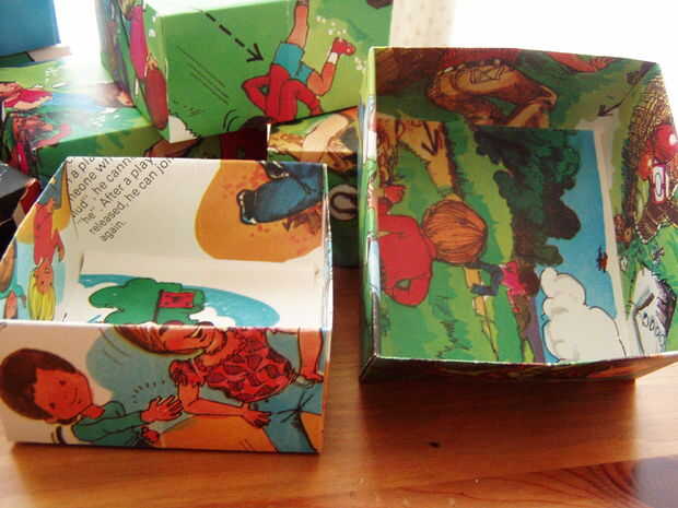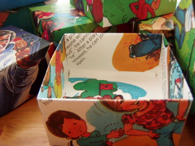Para hacer más pequeños, doblar su plaza partida por mitad diagonalmente, dejando un borde de aproximadamente .5cm en el exterior (marcado con una pluma) y cortar esto. Ahora hacer la caja como antes.