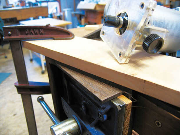 El diseño llama para que algún material de los lados de base para formar el reborde de la parte superior de la caja en. Después de quitar el exceso de pegamento con una espátula cuidadosamente había marcado hacia fuera el ángulo y luego se retira la mitad del espesor de los lados. Para ello sujeta un borde recto a los lados y utiliza un patrón con la broca de fresadora en mi fresadora.