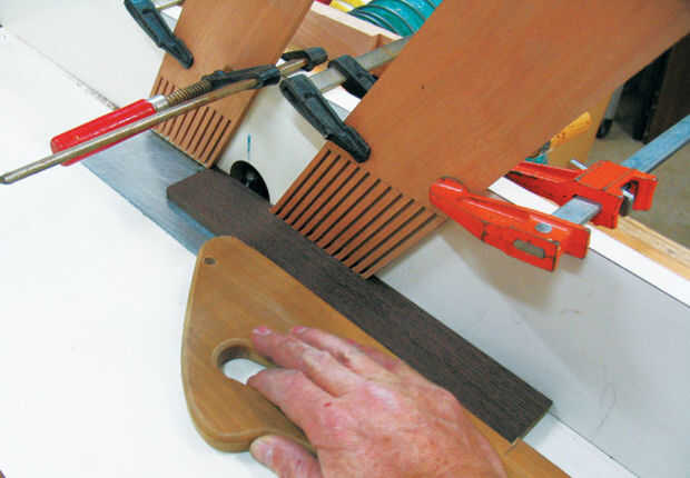 A continuación rápidamente afilé mi broca de fresadora de 45° con una piedra de diamante de grano 360. El wengé es de hecho difícil y un borde afilado de la herramienta era necesaria para hacer el enrutamiento de las Mitras fáciles, limpiamos y precisas. Dos dedos en mi cerca de la mesa de router guardó el material plano y seguro y mis dedos impidió demasiado estresante trabajo cerca de un cortador de movimiento rápido (foto 7).