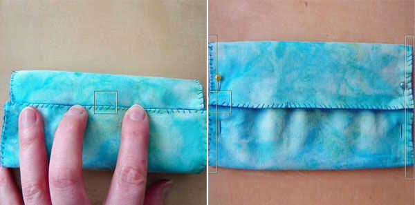 Enrollar el fieltro como muestra la imagen. Asegúrese de que el fieltro azul oscuro es hacia adentro. Dos lados del fieltro del perno y coserlas. No coser la abertura media de fieltro.
