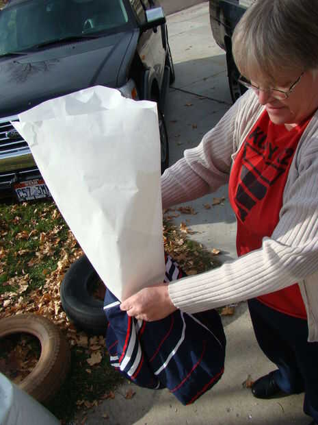 Esta siguiente parte es una actividad al aire libre, de dos personas,. Necesita una persona para sostener el embudo de papel en la abertura de la tapa. La otra persona levanta el pellets en la tapa de la tela. No quieres Mecharla completo. Usted necesita ser flexible para adaptarse sobre diferentes objetos de forma. Tendrá 4 o 5 galones cubetas de helado de pellets.