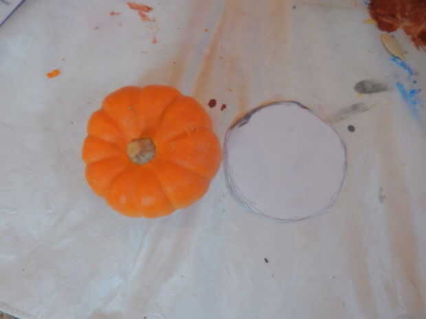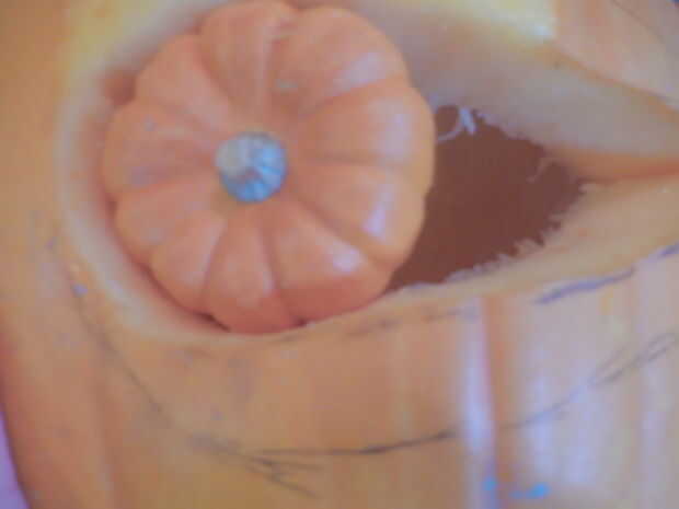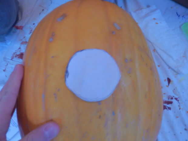 En primer lugar, coloque la calabaza más pequeña en una hoja de papel de impresión y trazar el contorno entero de la calabaza. El papel debe ser un poquito más ancho que el diámetro de la calabaza. Ahora cortar el círculo que trazó y colóquelo en la calabaza más grande en mitad de cualquier cara y traza el círculo con el lápiz negro. Ahora con la herramienta de talla, corte este círculo. Luego ampliar un poco el círculo en forma de boca. (consultar solo las fotos) Lo que usted está cortando hacia fuera no es el tamaño final de la boca (dientes incluidos), pero el interior de los dientes. Una vez terminado esto, se puede colocar la calabaza más pequeña dentro del círculo cortado sólo para asegurarse de que encaje. Es aceptable si el agujero es un poco demasiado, pero asegúrese de que no es demasiado pequeña.