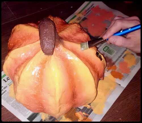 Pintar el interior de la calabaza primero. Usted debe elegir un color brillante. Duane utilizó un oro metálico. Duane mezclada cuatro diferentes tonos de naranja para crear reflejos y la profundidad a la calabaza. Hacer una capa completa de a naranja (color sólido sin mezclar) y déjelo secar completamente. Luego añadir tonos claros y tonos oscuros en los bordes para un acabado de imitación. Una vez que la pintura se realiza Asegúrese de proteger su trabajo con una capa superior protectora transparente, si estás poniendo fuera de uso un barniz de espato. Usar la capa transparente en el interior. Nota: No es necesario usar barniz, sin embargo usted no sería capaz de poner la calabaza fuera a menos que barnizado.