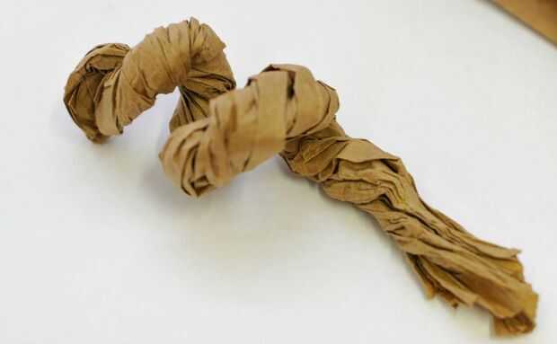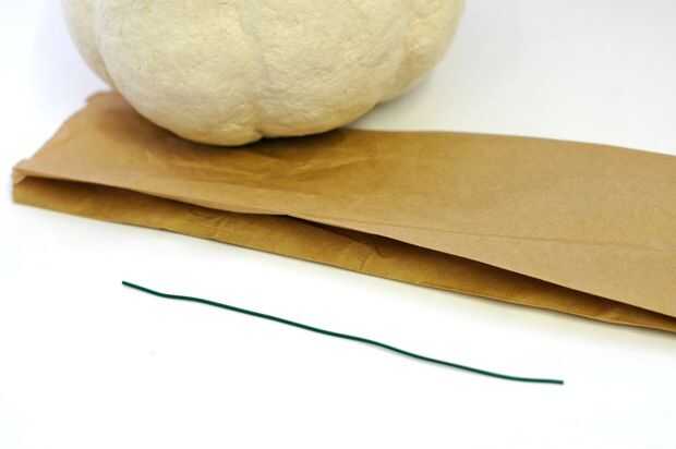 Para empezar a crear el tronco mientras se está secando la calabaza. Cortar un trozo de alambre de cobre de calibre 20 10" de largo. Colocar este dentro de la bolsa de papel larga y estrecha. Comience a girar la bolsa de papel para hacer el tallo de la calabaza.