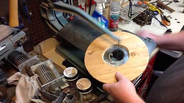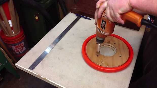 En este paso tienes que cortar un agujero de 4 1/4 de pulgada en la tapa del cubo para que coincida con el agujero en la madera y después de este paso sandwich la tapa cubo entre la madera contrachapada y taladre unos tornillos para mantenerlos juntos.