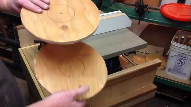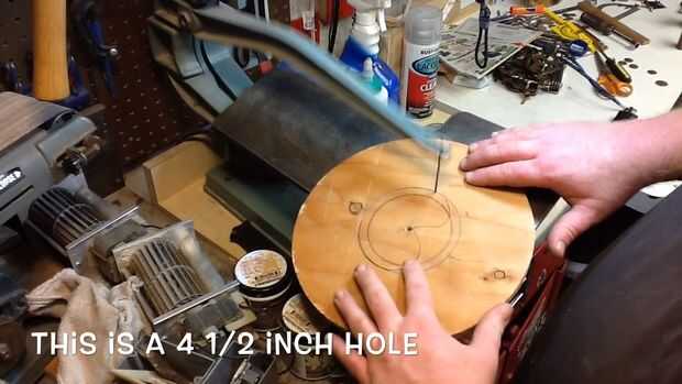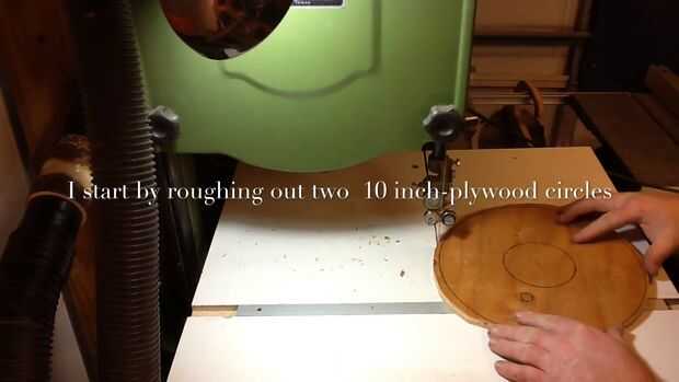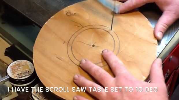 Lo primero es cortar 2 círculos de madera contrachapada de 10 pulgadas con una sierra de cinta o de vaivén, o sierra después de los 2 círculos se cortan te tendrán que cortar el centro de un agujero de 4 1/2 pulgadas con la mesa de la sierra en ángulo de 10 grados.