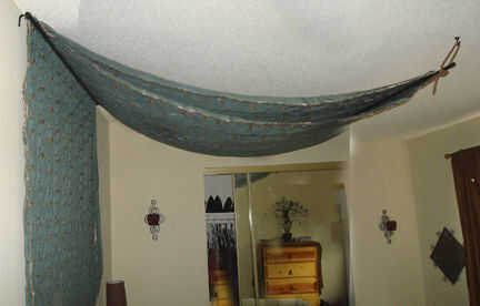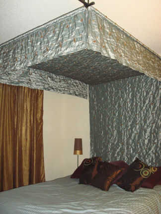 Anidación con mi novia trajo nuestras atenciones a nuestro dormitorio muy sencillos y el objetivo común de lo que es romántico, o mejor aun, sexy. Acordamos que añadir un dosel sobre la cama podría ser justo lo que necesitábamos. Buscando en Internet fue menos satisfactoria, con patrones que ya sea demasiado formal como una cortina, o arreglos de gasa que parecía a menudo glorificaban mosquiteros. Sin inmutarse, que decidimos hacer un dosel de diseño propio que simplemente subió la pared detrás de la cama (en la cabecera de la cama), enciende una varilla de cortina cuelgue luego espectaculares a lo largo de la longitud de la cama a la otra barra para prever un panel vertical de 12" o algo así sobre el pie de la cama. Después de un viaje con el distrito de tela y la compra de 10 yardas de tela de tapicería-grado, se instaló un funcionamiento de prueba, para ver cómo fluyó la tela, cómo efectuó las proporciones de la habitación y así sucesivamente.