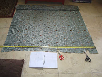Me preocupaba un poco con las perspectivas de corte paneles super rectos, algunas de las cuales funcionaron 13' de largo! Pero lo que encontré fue si puse el material en el piso, las líneas de lechada siempre grandes referencias para poner el material directamente. Entonces pude marcar mi cortes, seguir el patrón de la tela como puntos de referencia que va para arriba y cortar todos mis cortes largos al mismo tiempo.