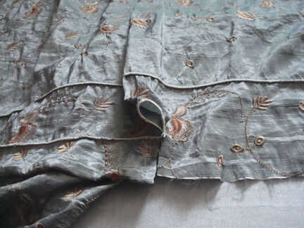 PIN luego coser los paneles C y D al grupo A. importa debe tomado para que las partes delanteras de la tela fin que desee: acabado o delantero lado del Panel A se abrirá hacia la cama; paneles laterales haya lados hacia fuera. Aquí otra vez, opté por usar a mi remalladora para esta costura pero también funcionará una puntada recta. Si utilizas a una remalladora, seguir el borde del Panel A para 4" más allá del final de C. Panel de acabado Este 4" más adelante será la 4 manga de rod de cortinath que recorre el borde de la pared de la cabina. Si se utiliza una máquina de puntada recta, esto no es un problema.