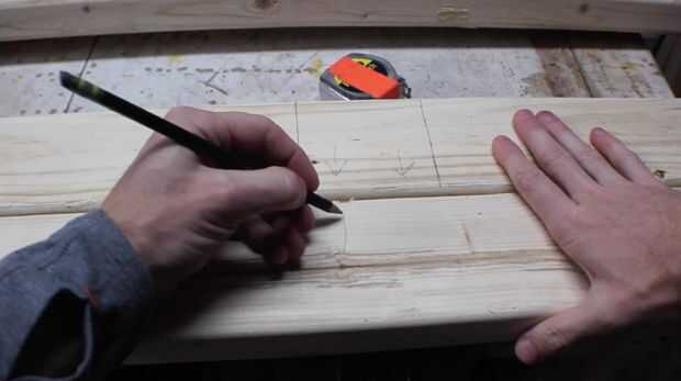 Cortar ocho cortos 2 × 4 y dos de largo 2 × 4. Marca donde añades los agujeros de bolsada.