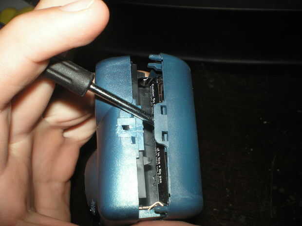 ahora tenemos que tomar el appart de cámara desechable. la cámara tiene una pegatina grande envuelta alrededor de él, usted wana que tomar (no uso agua. después de la etiqueta engomada apagado utilice un destornillador y empujarlo bajo 1 de los clips de poco a ambos lados de la cámara.