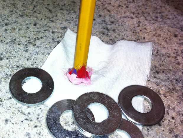 DAB las rayas de pintura roja sobre el pegamento y un poco más en el lápiz para un efecto de sangre en el lápiz.