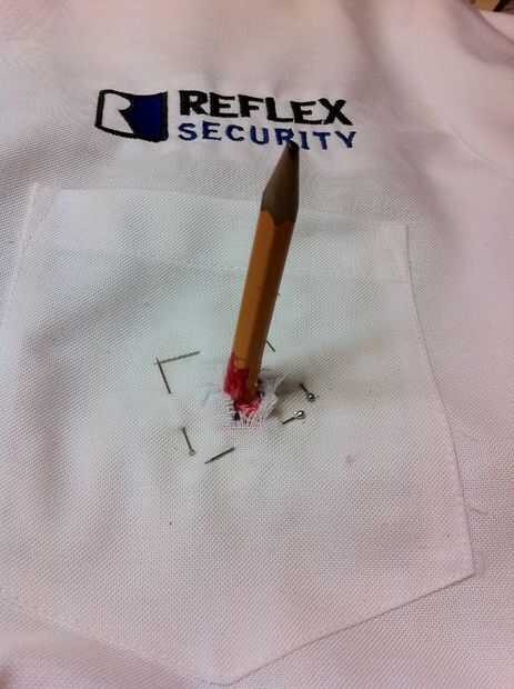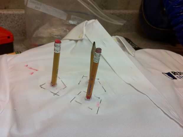 Usando pegamento para tela Coloque los lápices a la camisa. Use alfileres rectos para unir la tela y la camiseta mientras se seca. El pegamento para tela tarda 24 horas para secar completamente.