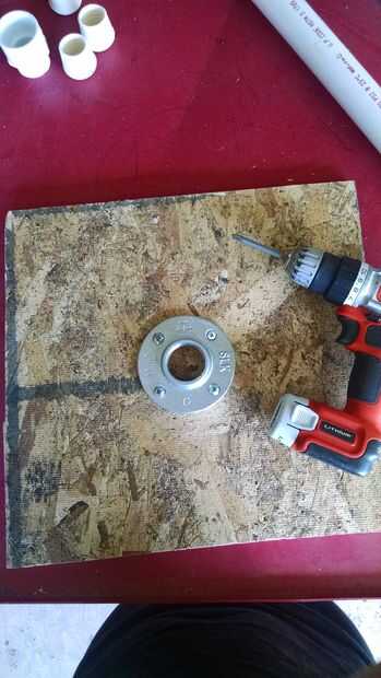 En la madera contrachapada de centro de la brida de piso de hierro galvanizado. Una vez que han centrado la brida del piso tendrá que agarrar el destornillador o taladro eléctrico y sus 4 tornillos para madera. Habrá corte circular 4 salidas en la planta del reborde, esto será donde se insertarán sus tornillos para fijar la brida. (Asegúrese que los tornillos no son demasiado estrechos, esto puede causar que el reborde para mover de lugar, la cabeza del tornillo debe ser más grande que la abertura para el corte circular salidas. También asegúrese que los tornillos no se asoman por la parte inferior de la madera, esto potencialmente podría causar lesiones cuando recoger la camiseta y la voluntad también causan que sea desequilibrado). Cuidadosamente el tornillo o los tornillos del taladro en su lugar. Después de que ha jodido la brida del piso en lugar intenta moverla, si no mueve le puede continuar al paso 3, si se mueve que tienes que apretar los tornillos más o tratar de un tornillo de cabeza más grande.