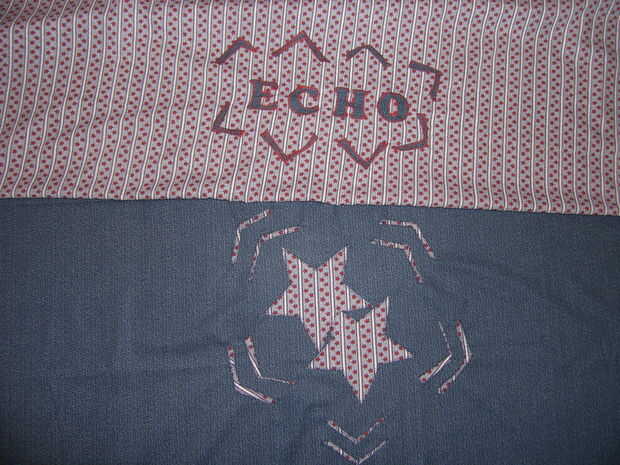 Fusible de la maravilla bajo directamente a la parte posterior de la tela que desea utilizar para el emblema o palabras. Dibujar su emblema o palabras de plantilla sobre la tela luego recorto con unas tijeras de su fiel tela y comiencen a fusionar a la derecha del cabo.