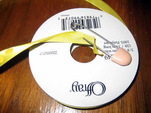 Una vez que el tubo en la parte superior, tome su carrete de cinta e Inserte un alfiler en el extremo. Enrosque el perno de seguridad (debe ser cerrado!) a través del tubo, estruje el cabello a la tela hacia abajo sobre el perno de seguridad y luego tirando del mismo poco a poco.