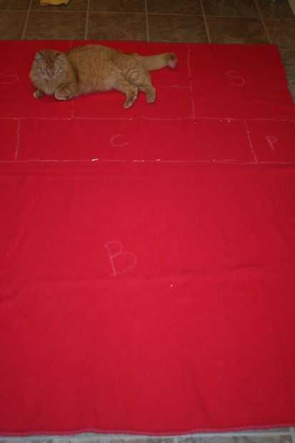 Medir las piezas y marcar las líneas con los pernos. Marqué las mediciones con tiza para poder verlos mejor. El cuerpo de la capa es de 42 pulgadas de la parte inferior de la mitad de la manta. Para hacer su propia capa, mida su cuello para la distancia del piso y restar aproximadamente seis pulgadas. Incluso puede restar más, dependiendo de cuánto tiempo desea el abrigo para terminar. Estos son básicamente la pantorrilla porque espero sus portadores para llegar mucho más alto en no mucho tiempo. La capa amarilla es de 47 pulgadas. Yo uso el borde final de la manta como la parte inferior de la capa y los lados terminados como las dos partes delanteras de la capa. Así, no tengo que terminar los bordes con puntada de manta. Usé el borde acabado de los extremos del manguito y las tapas de bolsillo también. Para un capote normal, de una manta de punto, utilizando los bordes acabados también pondrá tus franjas en los lugares correctos. Que es, a lo largo de la parte inferior del cuerpo de la capa y a lo largo de los pun ¢ os, horizontalmente.