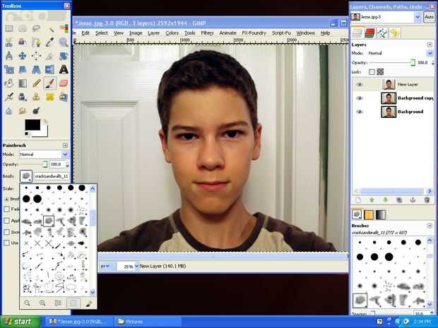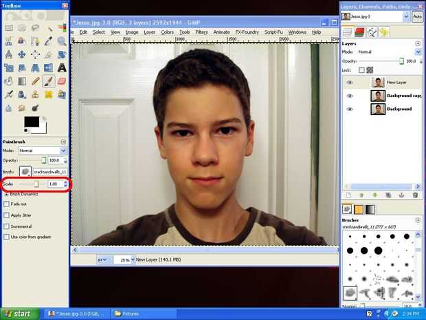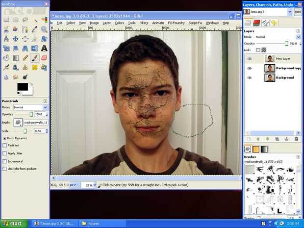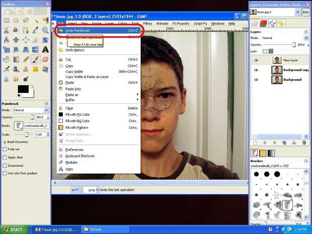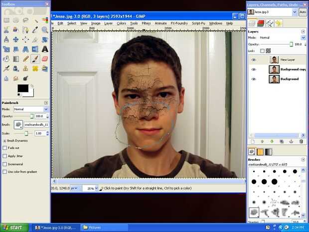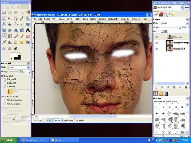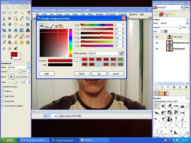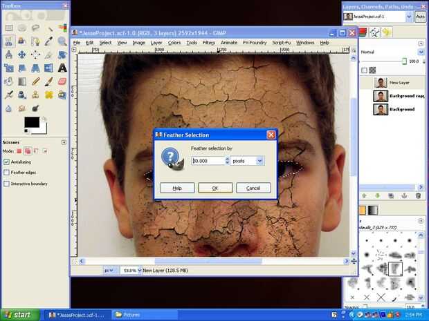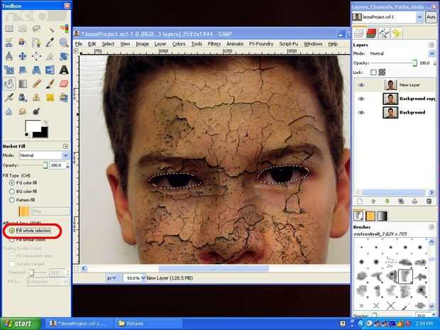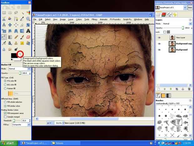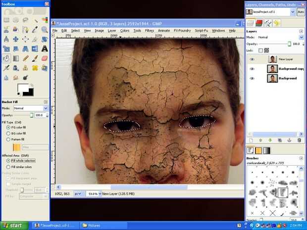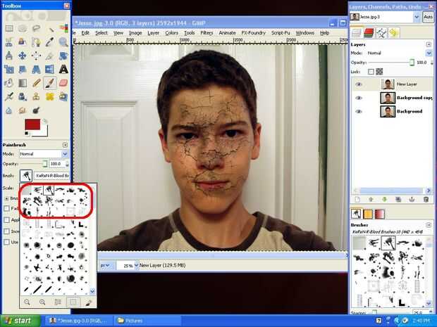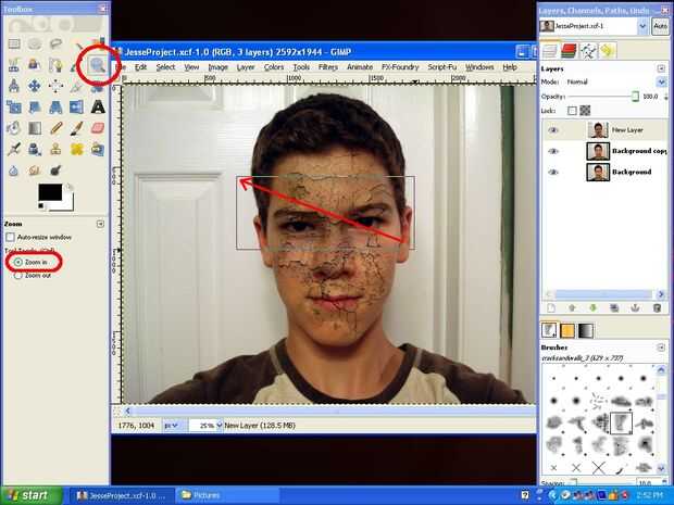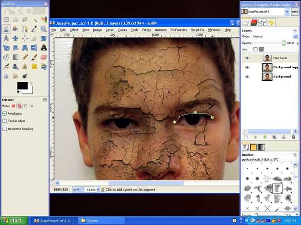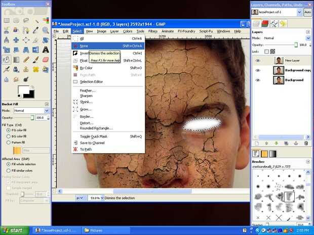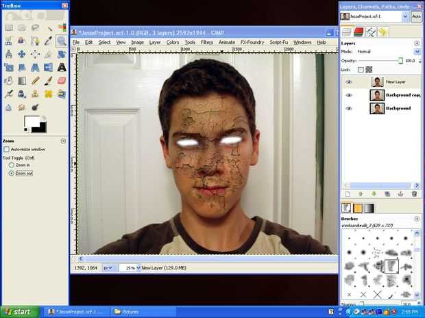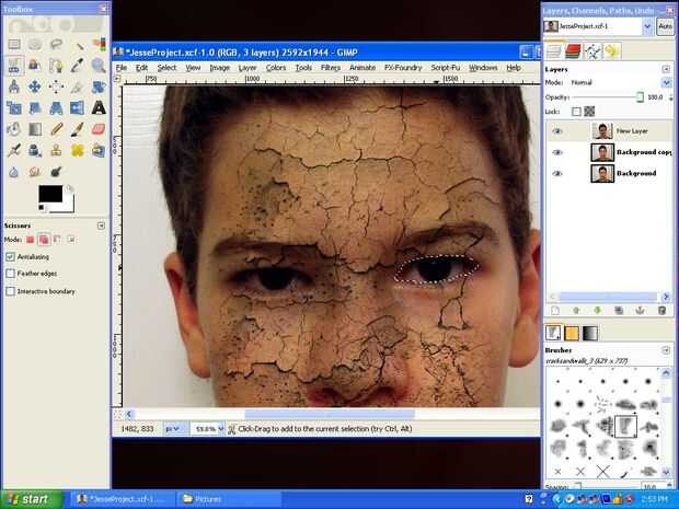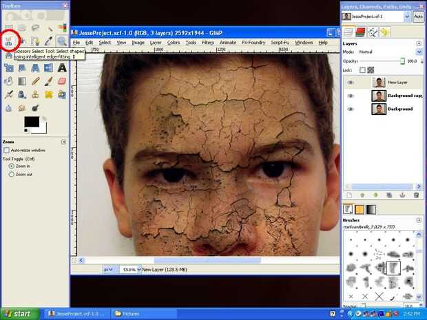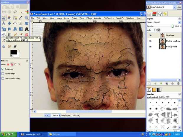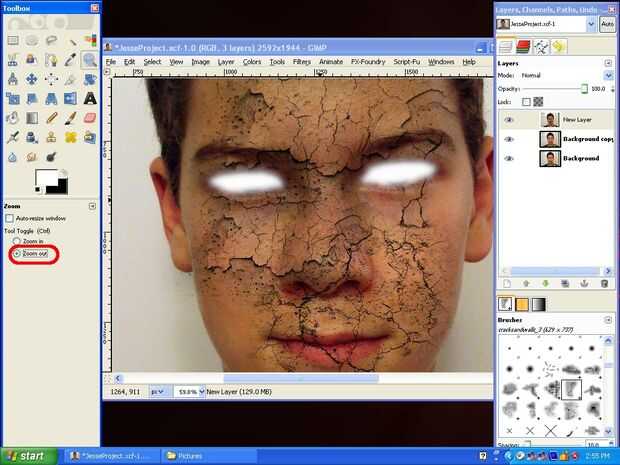 First off, make sure your on the top layer called "New Layer". Seleccione la herramienta pincel en el cuadro de herramientas a la izquierda y use los cepillos sangre y grietas al desplazarse a través de sus pinceles y seleccionar uno. Usted puede ajustar el tamaño, opacidad y otras opciones de pincel en los ajustes del pincel en la parte inferior de la ventana cuadro de herramientas. Para utilizar los pinceles de sangre, cambiar color a un color sangriento y seleccione un pincel de sangre en el menú de pinceles. Decidí no utilizar sangre, pero creo que se vería mejor si lo hizo, así que utiliza sangre! Utilizar diferentes tamaños y formas de pinceles para variedad y así no se ve repetitivo. Si usted comete un error, haga clic en Edición > Deshacer o pulse Ctrl + Z. Para dar a los ojos un resplandor de zombie, seleccione un color brillante en el lugar por defecto negro, blanco, amarillo o rojo. Elegí el blanco para simplificar, pero puede utilizar cualquier color que mejor adapta a tu personaje. En este punto, hace el trabajo mucho más fácil de ampliar. Para ello seleccionar la herramienta Lupa y creando un cuadro alrededor de los ojos para acercar la imagen. También puede acercar y alejar pulsando el + y - teclas del teclado. A continuación, haga clic en la herramienta tijeras inteligentes del cuadro de herramientas y cambiar el modo a la opción "añadir a la selección actual" en la configuración de la herramienta por debajo de la caja de herramientas, así que podemos seleccionar ambos ojos al mismo tiempo. Tijeras inteligentes trabajan comparando los píxeles que coloca los puntos a lo largo de los píxeles al lado de ellos para determinar donde están las líneas básicas. Esto resulta útil al seleccionar cosas (como ojos). Para seleccionar los ojos, comience por colocar puntos alrededor del primer ojo. Una línea a seguir cada punto colocado hacia abajo a lo largo de cualquier trayectoria reconocible. A pesar de estas Tijeras son "inteligentes", no son perfectos y a veces equivocamos. Está bien. Normalmente esto puede corregirse agregando un nuevo punto entre los puntos donde el problema persiste. Simplemente arrástrela hacia el camino como mejor se puede y se debe corregir a sí mismo. Cuando casi ha alcanzado el primer punto que hiciste, haga clic para cerrar la selección. Seleccione ambos ojos de esta manera. Para hacer el brillo de los ojos, no sólo vuelven de su color, plumas de la selección haciendo clic en seleccionar > pluma y establece el valor de la pluma a cerca de 30 o más, dependiendo de cuánto quiere brillar. Haga clic en la herramienta de cubo de la caja de herramientas y seleccione la opción en la configuración que dice: "relleno toda la selección". Ahora haga clic dentro de uno de los ojos seleccionados y ambos deben girar su color primario (que era blanca en mi caso). Haga clic en seleccionar > ninguno. Ahora mejor sería alejar. Si con la herramienta Lupa, marque el círculo junto a "Alejar" a alejar en lugar de. Simplemente haga clic en la imagen para hacer zoom hacia fuera.