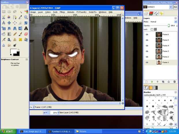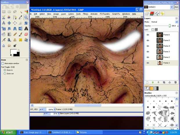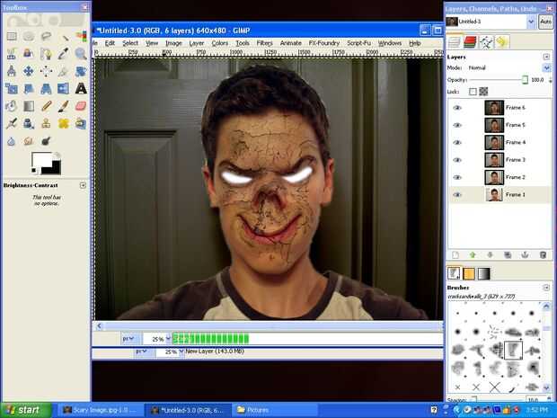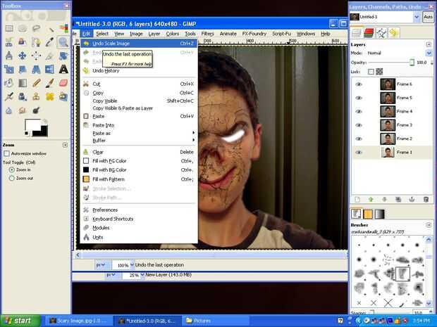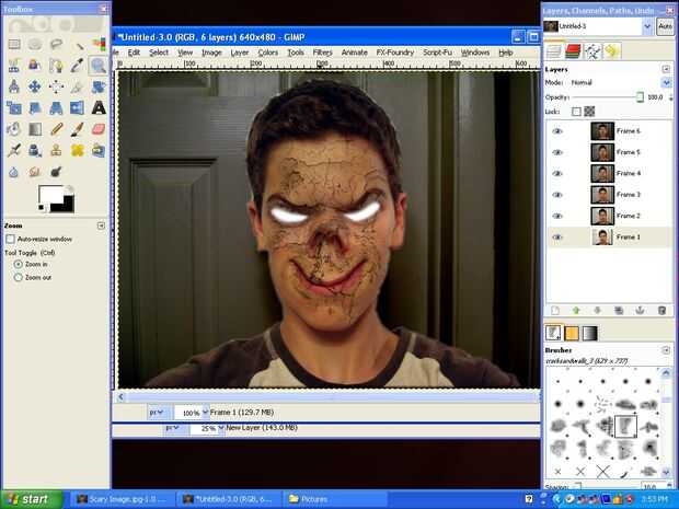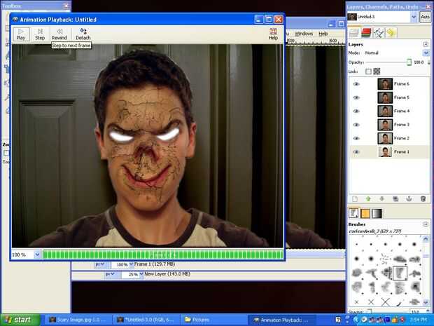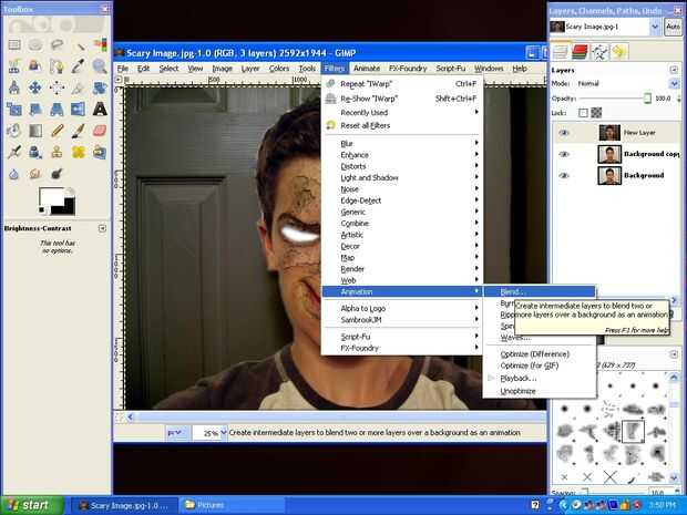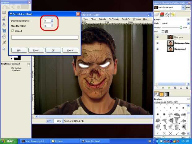 Para animar la cara, haga clic en filtros > Animación > mezcla. Establecer el número de fotogramas intermedios basados en cuánto tiempo usted desea que tome la imagen original para transformarse en el espeluznante. Si desea una transición más suave, Desenfoque, ajuste el radio de desenfoque máximo. El radio de desenfoque es cuánto desdibuja entre cada fotograma. Fui con un enfoque más bloque de la transición, pero usted debe experimentar para obtener mejores resultados. También aconsejaría que para desmarcar la casilla de "Bucle" por lo que va a cambiar una vez y no seguir adelante y hacia atrás. Haga clic en aceptar y espere a la carga.