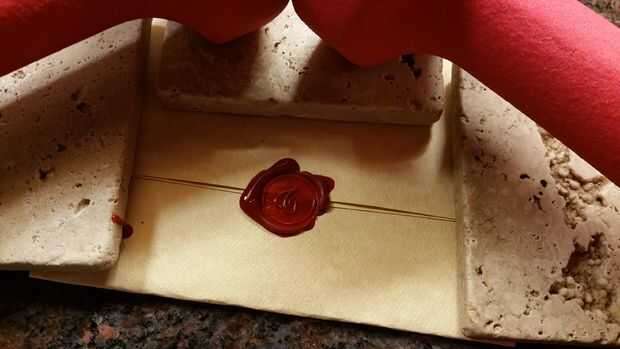 Una alternativa sería evitar sellando el borde y utilizar una cinta o cadena así: http://www.missivemaven.com/2011/05/sealed-with-ribbon-and-wax.html. Esto significaría que el sello no interfiriera con el Sudoku.