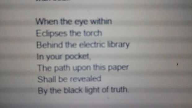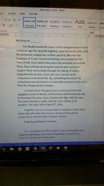 La carta más larga fue diseñada para establecer la atmósfera de la sala de rompecabezas y proporcionar motivación para resolver la sala. El segundo (el enigma) es la primera pista para resolver la letra: