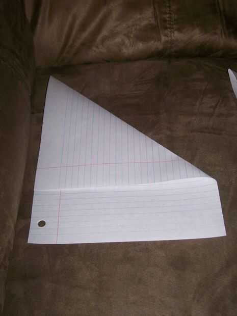 Doble en la esquina superior derecha del papel de cuaderno para satisfacer casi la parte inferior de la esquina inferior izquierda del papel de cuaderno, como se ve en la foto de arriba.