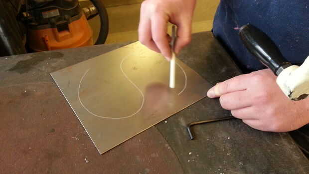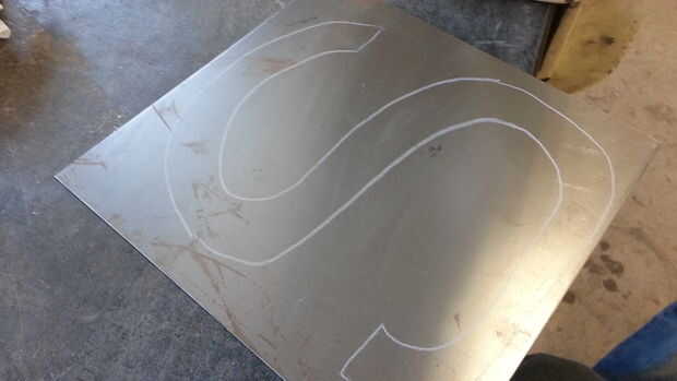 Usé la esteatita para dibujar a mano alzada la letra "S". Usted puede conseguir esteatita en el puerto de carga o en la sección Herramientas (cerca de equipos de soldadura) de Lowe. Es fácil ver la letra de la chapa y también es fácil de limpiar cuando se hace.
