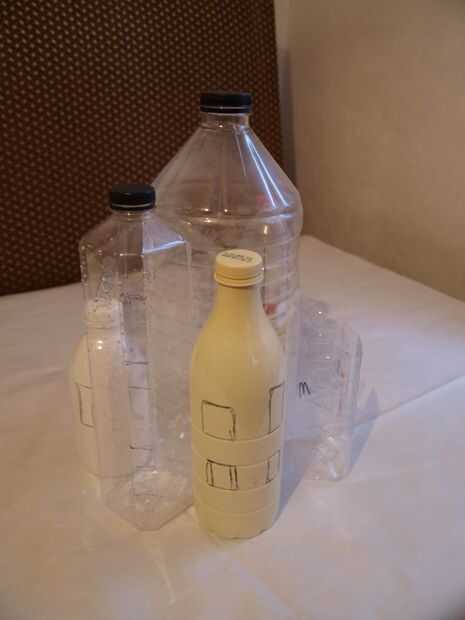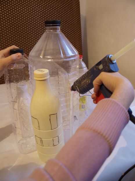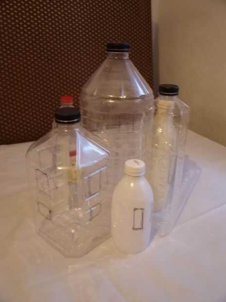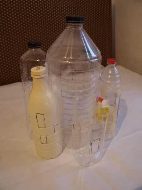 Para este paso necesita sus botellas de plástico y pegamento caliente. Comenzamos con la botella grande en el centro y pega las otras botellas alrededor de él. Hemos intentado utilizar diferentes formas y tamaños que se alternan las botellas cuadradas con las redondas, las botellas pequeñas con los grandes. Este paso es muy importante porque ahora usted decide qué forma va a tener su casa. Usted puede cortar algunas de las botellas donde se unen para una apariencia más agradable. Asegúrese de que la pistola encoladora no esté demasiado caliente porque botellas de plástico fácilmente pueden cambiar de forma cuando se calienta. Decida ahora donde irá el windows e incluso puede dibujarlos en las botellas con un marcador permanente.