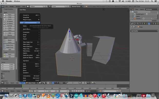 Una vez ha abierto software Blender, allí debe ser una forma de cubo simple colocada ya en la red, si no haga clic en el botón de forma en el panel izquierdo y luego insertar un cubo y luego inserte también forma de cono. Estas formas se pueden mover arrastrando las flechas azules, rojizas y verdes de cada lado de las formas.