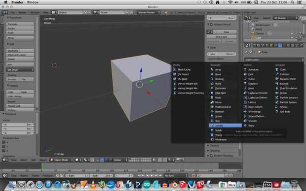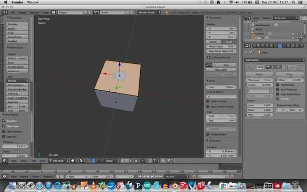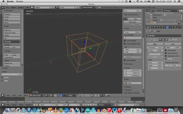 Añadir un modificador de solidificación por ir al icono de llave inglesa en el menú de la derecha. Esto hará que el espesor de la pared del cubo más gruesa (1cm de grueso) para que cuando se imprime con la impresora 3D será hueco y por lo tanto ahorrar recursos caros. Puede ver el efecto de entrar en modo de alambre.