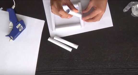 Cortar los cilindros de tamaño normales más cortos y pegar en una plaza que será la base. Cortar un trozo de tubo más grande y ponerlo alrededor del cilindro más pequeño en la base. Ahora el pedazo más grande girará sobre el cilindro base. Atacan a otro rollo de papel en la parte giratoria. Esto se utilizará como el brazo de la catapulta. puede ser más fácil de comprender este paso el video