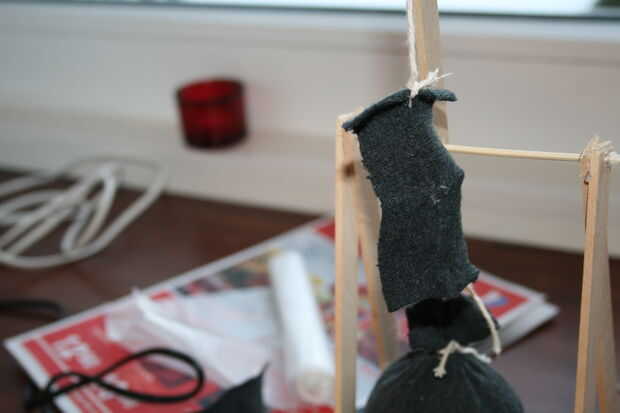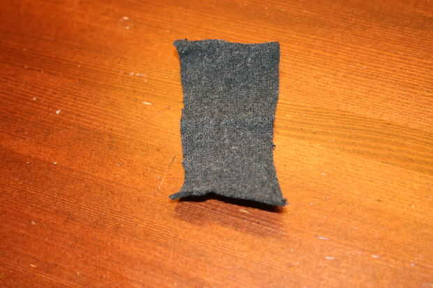 Hacer ranuras cerca del clip. Adhiera un pedazo largo de 26,5 cm (10.4 pulgadas) de hilo alrededor de los surcos. Tomar el exceso del calcetín y cortarse un pedazo rectangular pequeño. Perforar dos orificios y forzar la rosca en un agujero y otro la longitud casi igual como el último. (un poco más corto). Hacer un lazo y estás listo para ir.