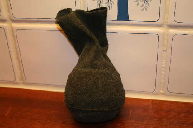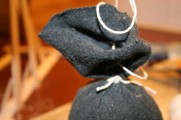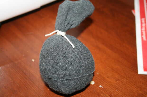 Haz tu calcetín viejo y cortar la parte inferior de la misma. Corte demasiado poco. Recuerde que usted puede siempre recortarlo más tarde. Llenarlo con piedras de tamaño pequeño. El peso realmente depende en cuantas piedras tiene y cuánto usted quiere que vaya. Amarrar con la cadena. Empujar los agujeros en cada lados sobre el nudo. Poner una pieza nueva del canal de la cadena ellos y amárrelas con el orificio de la parte inferior.