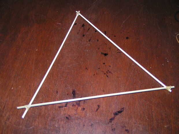 Dos pinchos más del hilo de rosca en dos de las articulaciones de su triángulo, luego dóblelos juntos y latigazo junta con otra banda elástica.