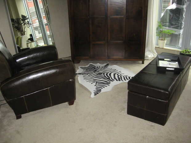 crear una alfombra de piel de imitación cebra utilizando tela y marcador permanente.