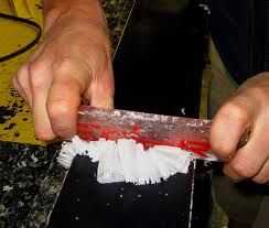 El último paso es para raspar las pistas de esquí. Asegúrese de dar tiempo para que la cera se enfríe entre planchado en y raspado apagado. Después que el esquí se enfríe puede comenzar a raspar hacerlo otra vez desde a partir de la punta y terminando en el cuento. Sostenga el s0 de raspador que está en ángulo hacia su cuerpo y empezar a empujar a lo largo de la base del esquí de la aplicación de presión media. Como haces esto verás la cera Pele revela una nueva capa brillante por debajo. por el momento haya raspado el esquí entero debe ser este nuevo color brillante.