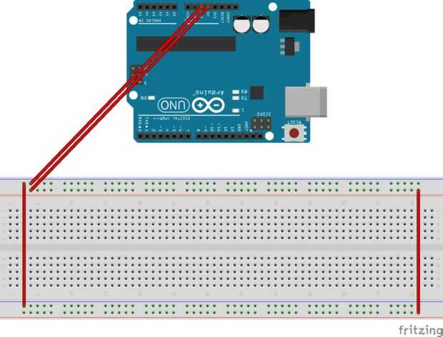 Lo primero que tienes que hacer es conectar el Arduino a la tarjeta del pan. Para ello, conecte la ground(GND) de la Arduino a la franja de negative(blue) en el protoboard con un alambre. Conecte otro cable en el agujero de 5 voltios (5v) en el Arduino y la franja (rojo) positivo en usted está el protoboard. El primer cable es normalmente marrón o negro y el segundo rojo. Continuación, ejecute un cable de un lado de la placa al otro lado, tanto en positivo. Hacer lo mismo con la tira de negativa.