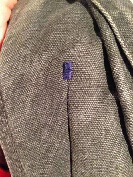 Ninguno de las costuras de la chaqueta tenía un final ciego, y yo quería añadir un nivel adicional de la fuerza y detalle, así que hice una puntada en la parte superior de ambos de los dardos. Una puntada es un zigzag muy ajustado hecho en la zona varias veces.