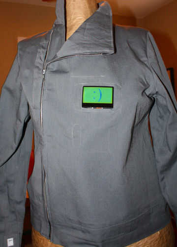 Me gustaría hacer una chaqueta que tiene una pequeña pantalla de LCD para crear subtextos para la interacción humana interpersonal. El usuario utilizaría un limitada "teclado" con botones y sensores de fuerza bajo las teclas de silicona suave para crear subtítulos textual ordenador a interacción humana (emoticonos textuales, es decir:: P). la dicotomía entre interacción personal que se presenta en espacio físico y que se produce en un equipo o en el espacio virtual será evidente y mensajería, juegos, mensajes de texto, correo electrónico y otras formas de interacción interpersonal distanciada de referencia. La pérdida de la entonación y el lenguaje corporal que se produce en la intersección de la informática y la comunicación textual es evidente en la cultura actual.